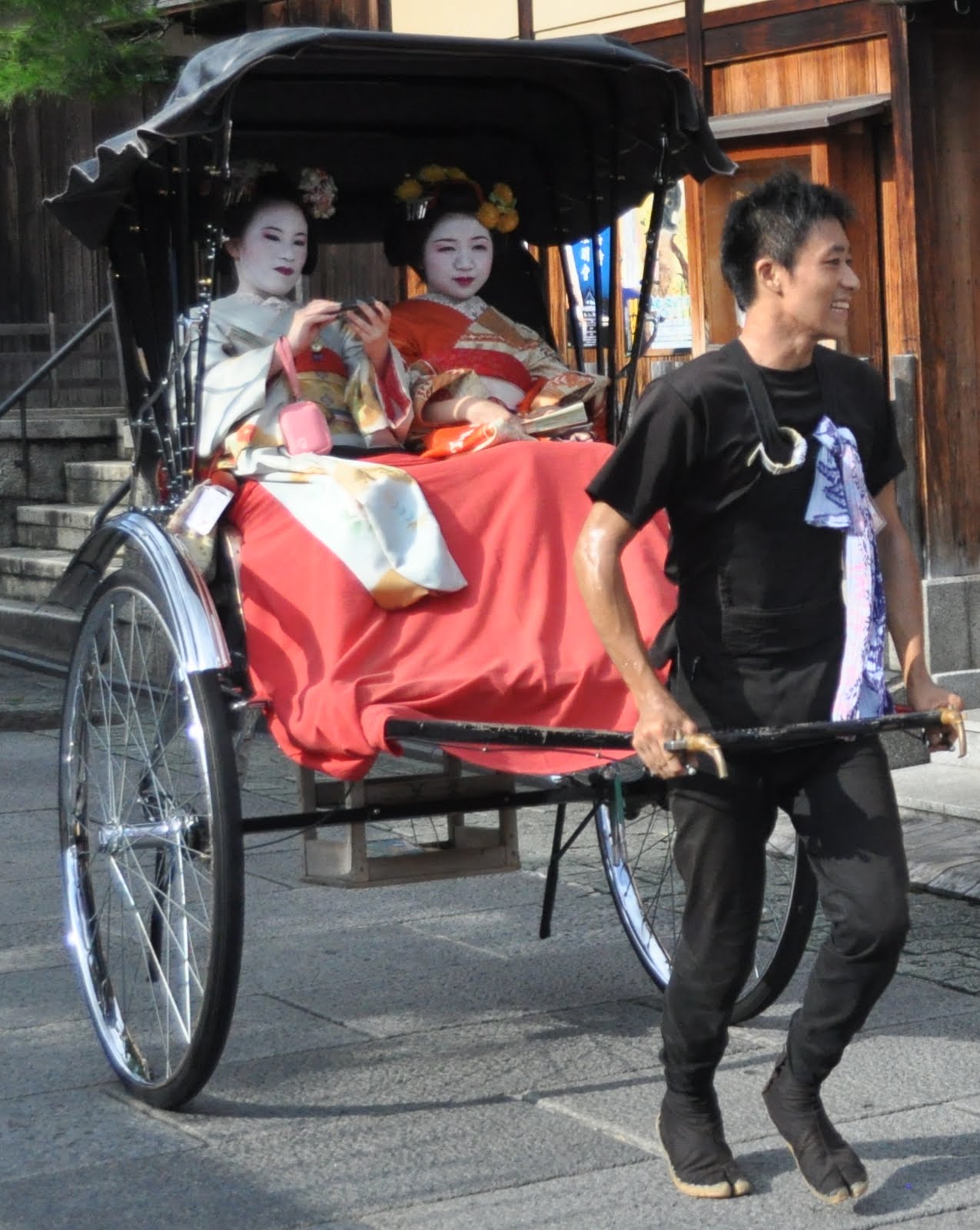 Aqui unas Gheisas paseando con su carrito por Kioto. Supongo que los comerciantes de este barrio pagan a las chicas para que vayan así de emperifolladas a estas alturas del siglo XXI, pero como turista que era yo, pues te hace gracia, la verdad.