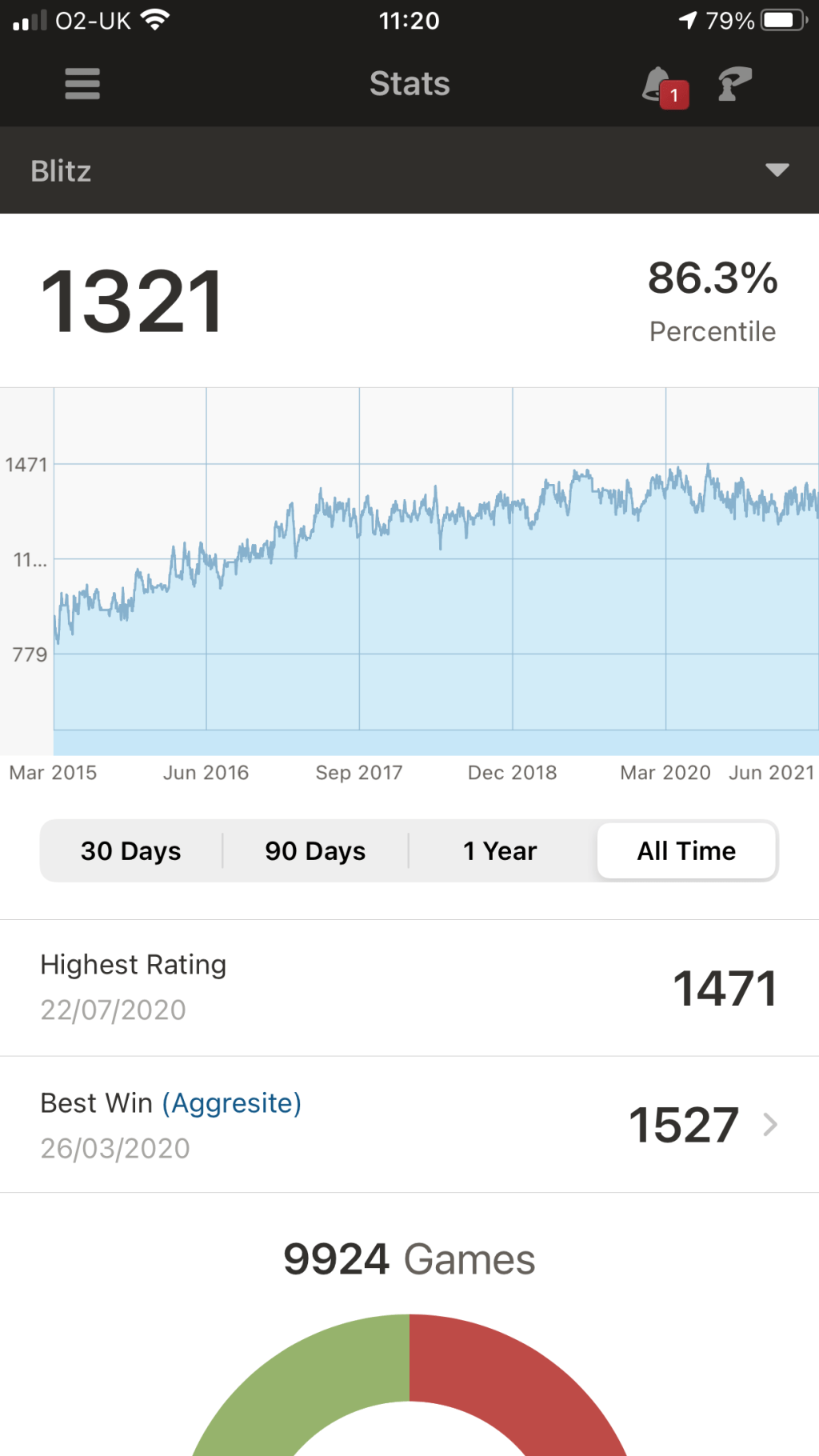 Uno de mis hobbies es jugar al ajedrez. Utilizo la aplicación «Chess», juego partidas de 5 minutos práctiamente todos los días con gente de todo el mundo, desde argentinos a indios pasando, por cualquiera de las repúblicas de la antigua URSS. Mi ranking habitual está en el rango de 1300-1400, con una máxima puntuación de 1471, que llegué a alcanzar hace ya más de un año.