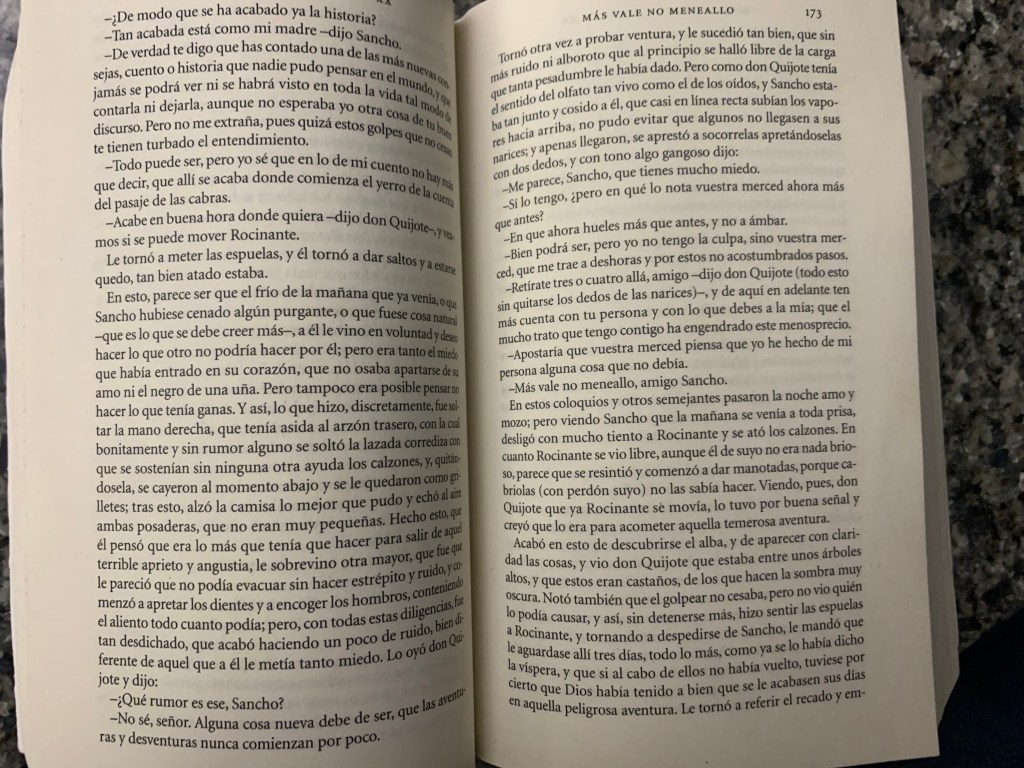 Hacía tiempo que no me reía con ganas leyendo un libro. Ayer me pasó, con unas páginas, nada más y nada menos, que de El Quijote. Porque a mi edad, lo reconozco, no lo había leído de cabo a rabo. Siempre se me atragantó, pero esta vez lo estoy disfrutando con la versión actualizada de Andrés Trapiello, que ajusta el vocabulario al castellano actual.